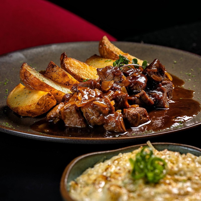 Filet em cubos com cebolas douradas ao Molho Spicy Meat, batatas rústicas e Arroz cremoso (picante)