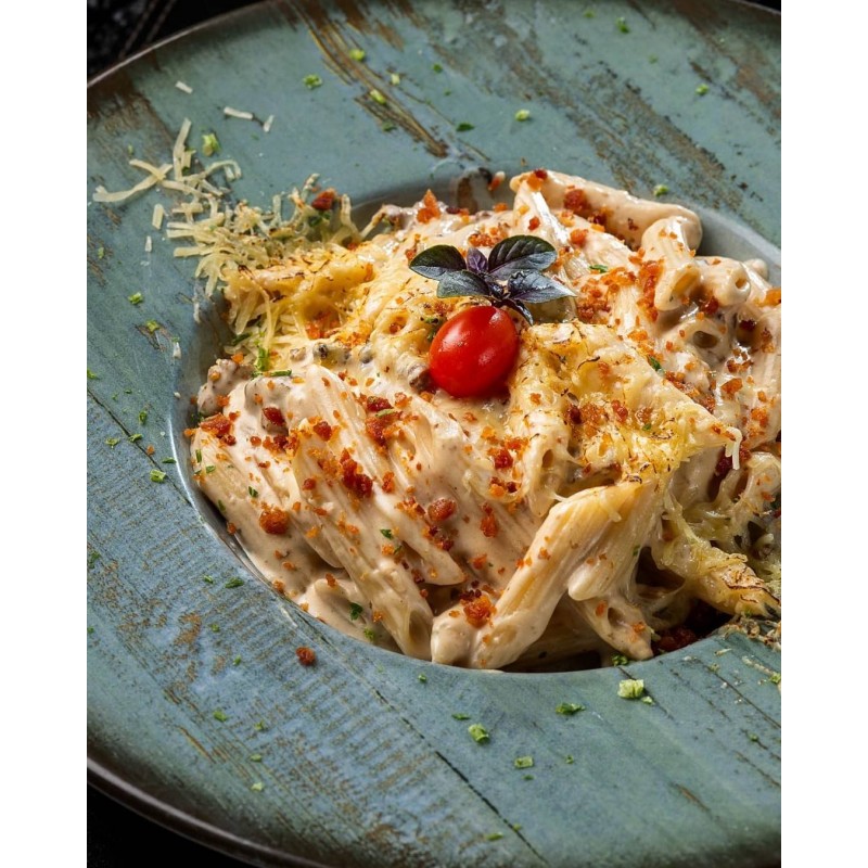 Penne ao creme de queijos nobres gratinados com bacon crocante